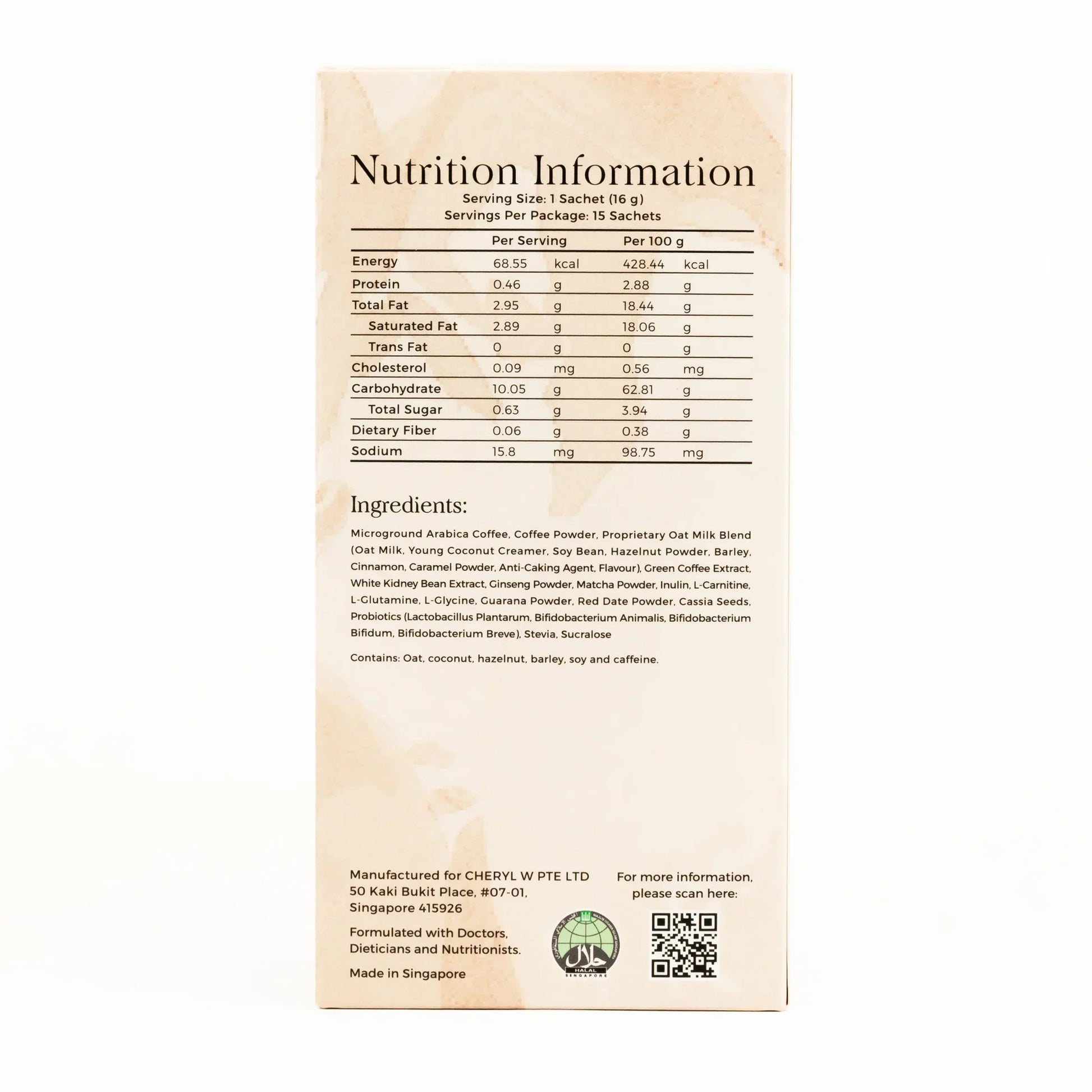 Microground Arabica Coffee, Coffee Powder, Proprietary Oat Milk Blend (Oat Milk, Young Coconut Creamer, Soy Bean, Hazelnut Powder, Barley, Cinnamon, Caramel Powder, Anti-caking agent, Flavour), Green Coffee Extract, White Kidney Bean Extract, Ginseng Powder, Matcha Powder, Inulin, L-Carnitine, L-Glutamine, L-Glycine, Guarana Powder, Red Date Powder, Cassia Seeds, Probiotics (Lactobacillus Plantarum, Bifidobacterium Animalis, Bifidobacterium Bifidum, Bifidobacterium Breve), Stevia, Sucralose