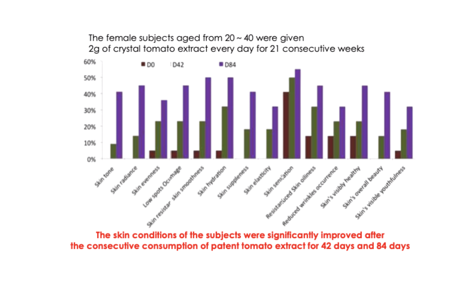 Studies showed that skin conditions of female subjects aged from 20 - 40 were significantly improved after the consecutive consumption of patented tomato extract for 42 days and 84 days.
