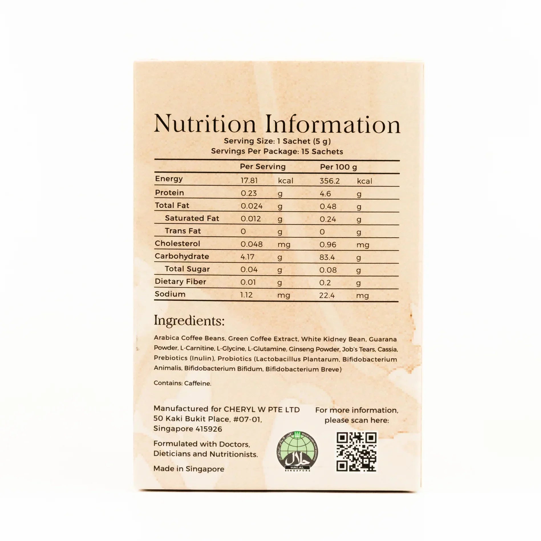 Arabica Coffee Beans, Green Coffee Extract, White Kidney Bean, Guarana Powder, L-Carnitine, L-Glycine, L-Glutamine, Ginseng Powder, Job’s Tears, Cassia, Prebiotics (Inulin), Probiotics (Lactobacillus Plantarum, Bifidobacterium Animalis, Bifidobacterium Bifidum, Bifidobacterium Breve)